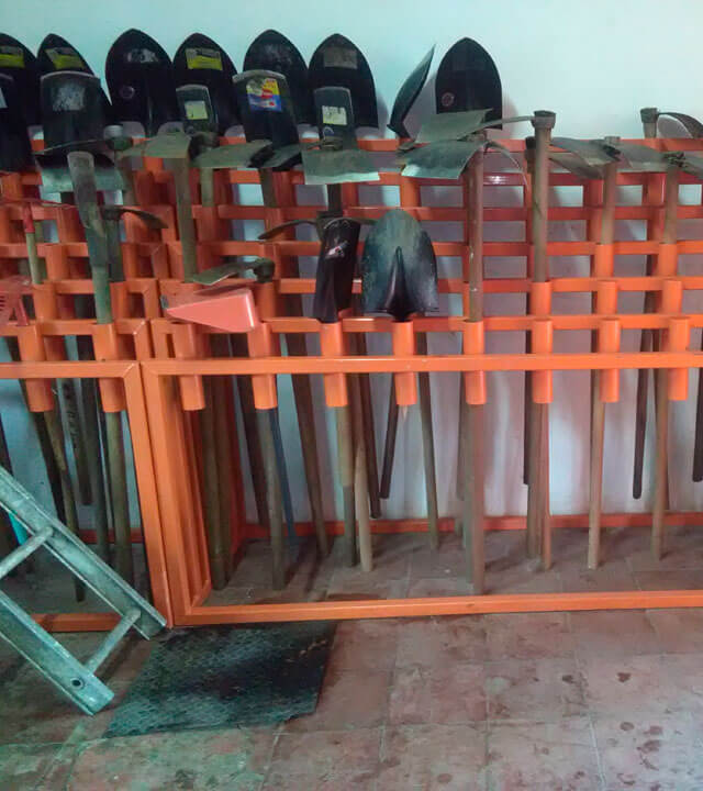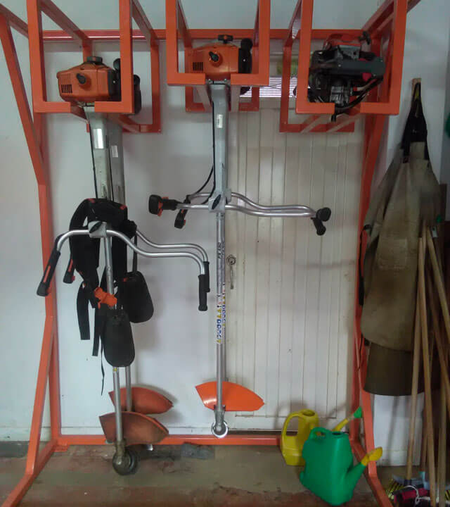 · Mesas de plantación, Estructuras para almacenamiento de guadañas, herramientas manuales, rollos